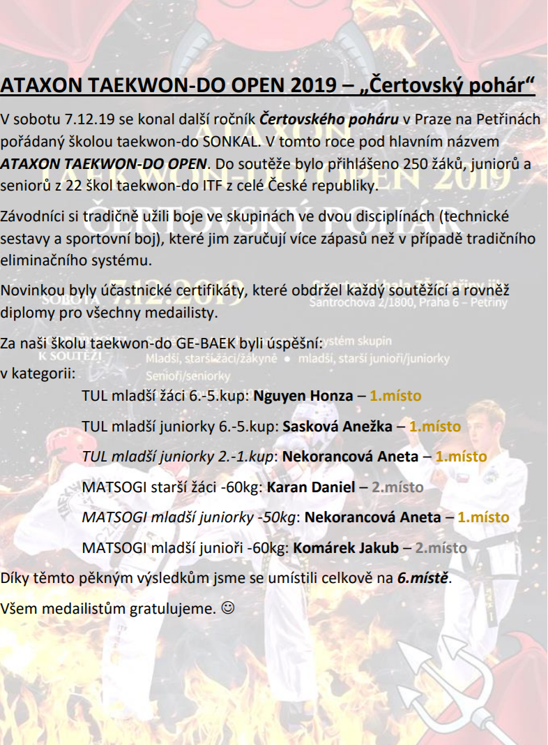 Do soutěže se přihlásilo 223 soutěžících z 16 škol Českého svazu Taekwon-Do ITF. Náš oddíl byl zastoupen 13 závodníky ve všech věkových kategoriích od mladších žáků po seniory. Každý se snažil do svého výkonu dát vše, což se odrazilo na zisku celkem čtyř zlatých, sedmi stříbrných a tří bronzových medailí. Navíc Jára Roggenbuck ve své kategorii získal za své první a druhé místo pohár za nejúspěšnějšího staršího žáka soutěže.